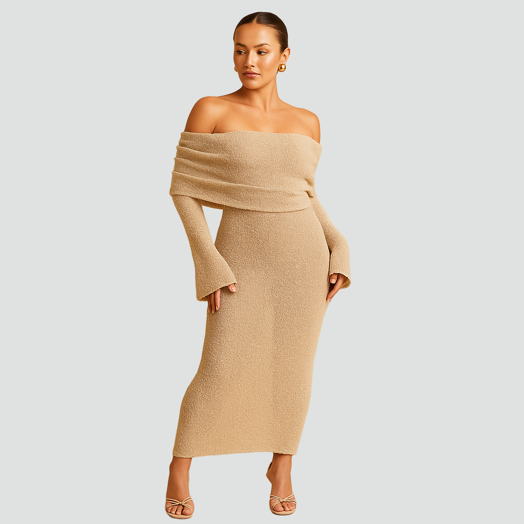 Długa dzianinowa sukienka z odkrytymi ramionami i długim rękawem