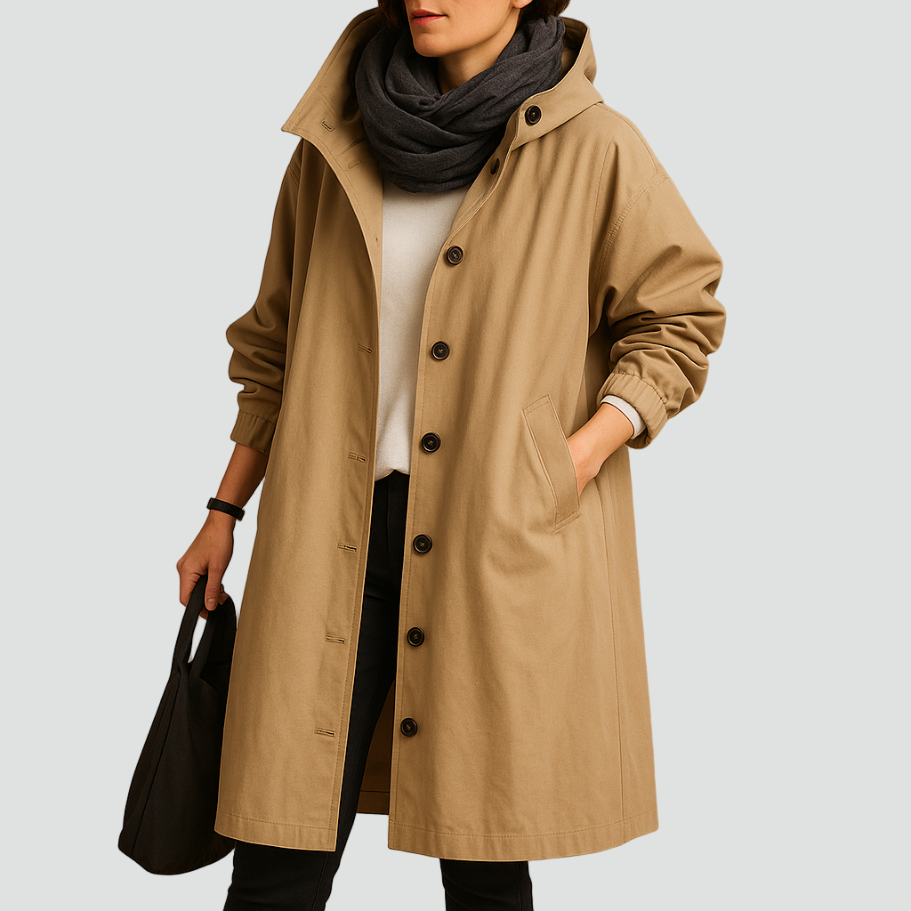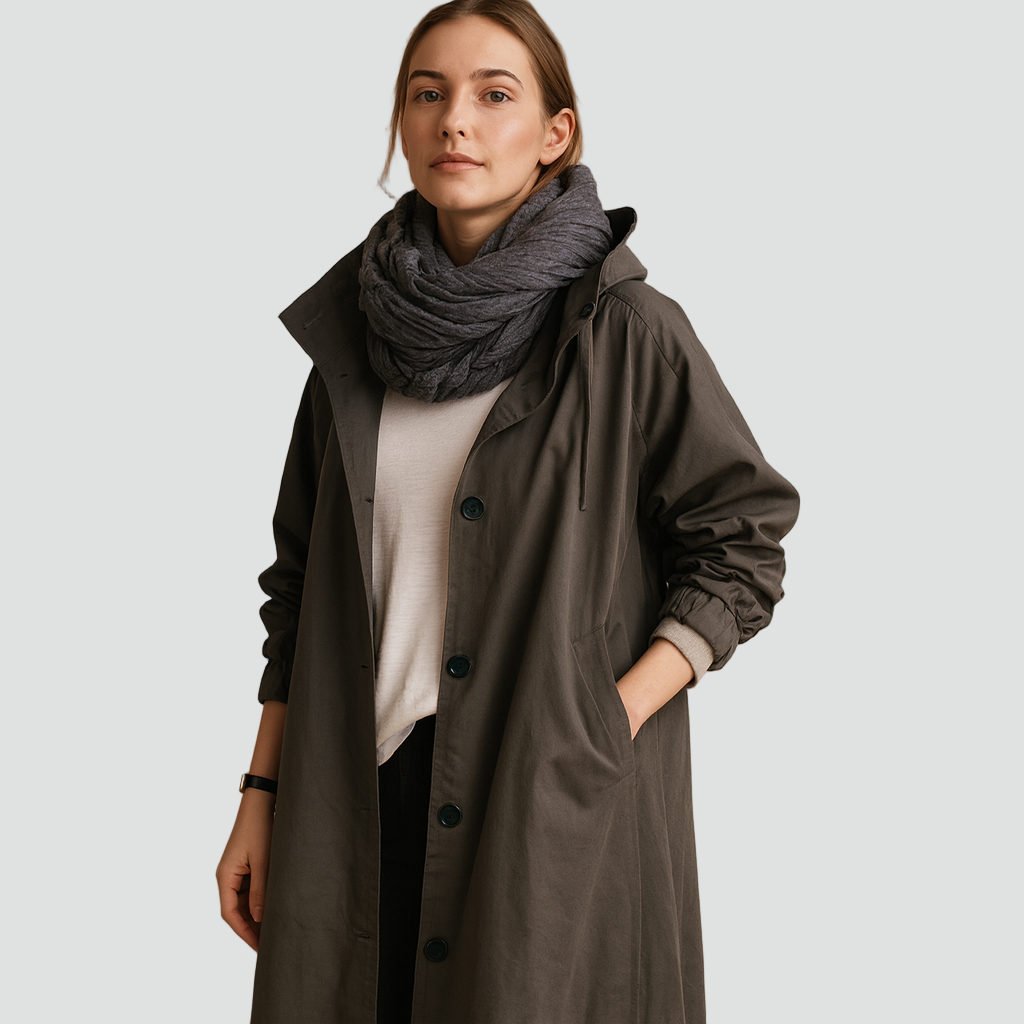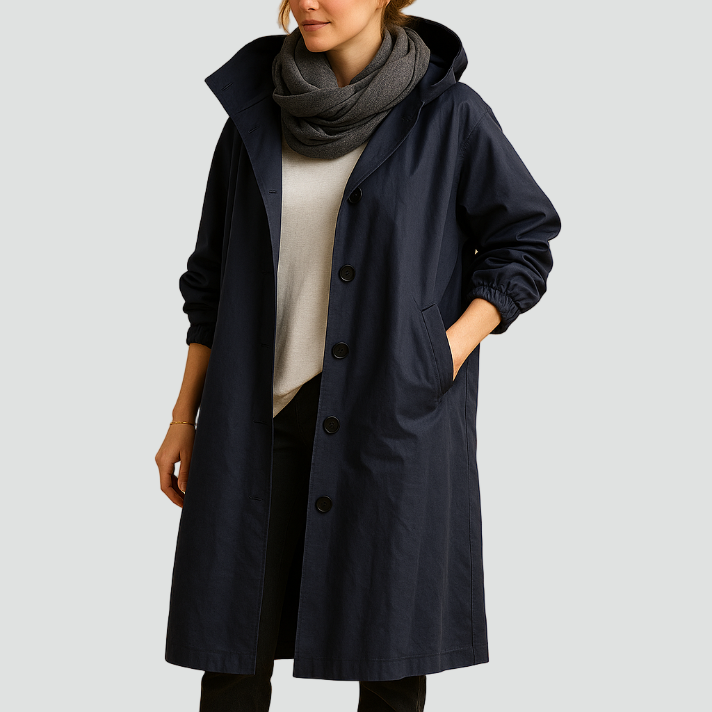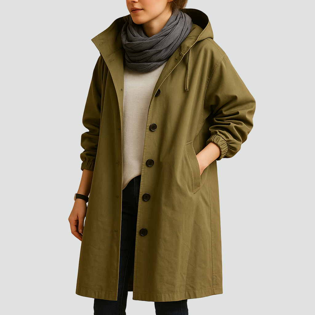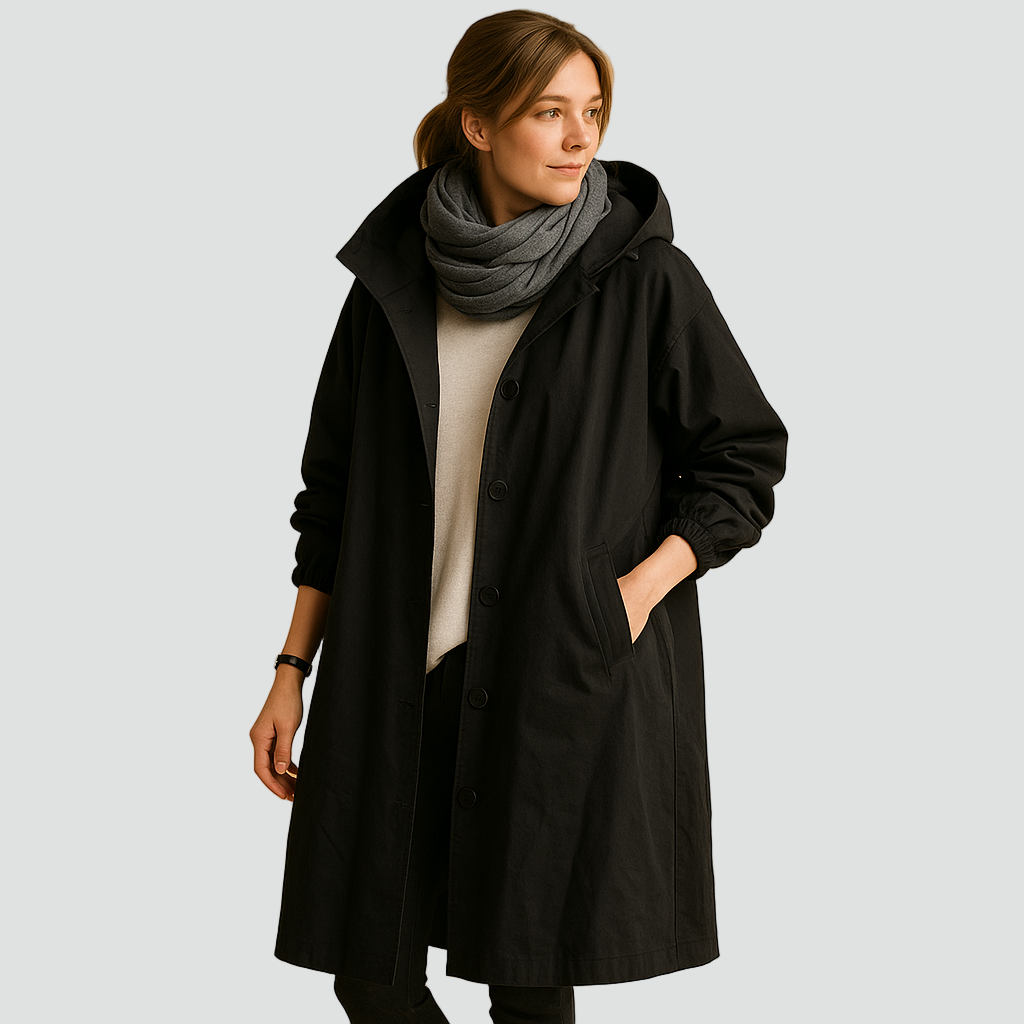 Praktyczny płaszcz przeciwdeszczowy o klasycznym kroju, idealny na deszczowe i wietrzne dni. Wykonany z gładkiej tkaniny odpornej na wilgoć, zapewnia wygodę i ochronę przed lekkim deszczem. Model z kapturem, długimi rękawami i zapięciem na guziki łączy funkcjonalność z minimalistycznym stylem.