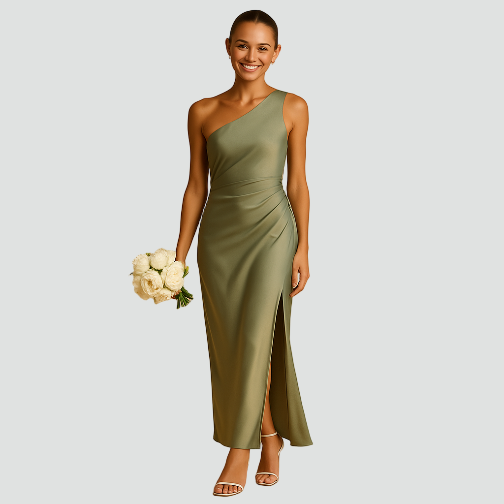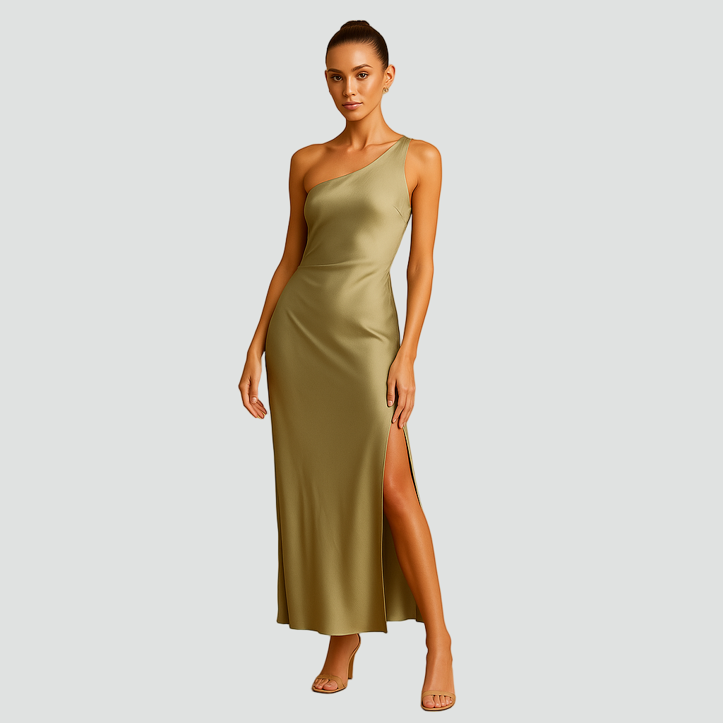 Zmysłowa i pełna wdzięku – ta długa sukienka koktajlowa to doskonały wybór na wesele, przyjęcie lub elegancki bankiet. Asymetryczny krój na jedno ramię subtelnie podkreśla linię ramion, a delikatne drapowanie w talii pięknie modeluje sylwetkę. Rozcięcie z przodu dodaje lekkości i kobiecego uroku.