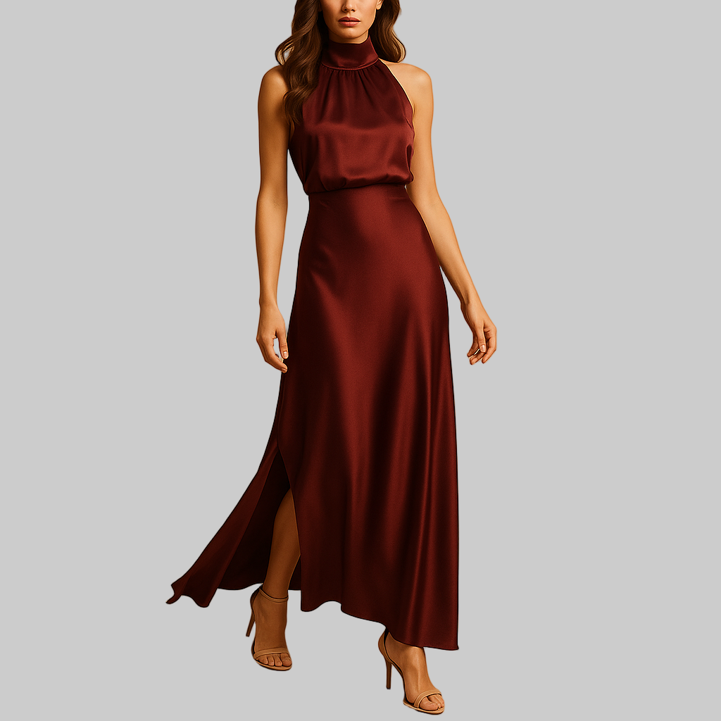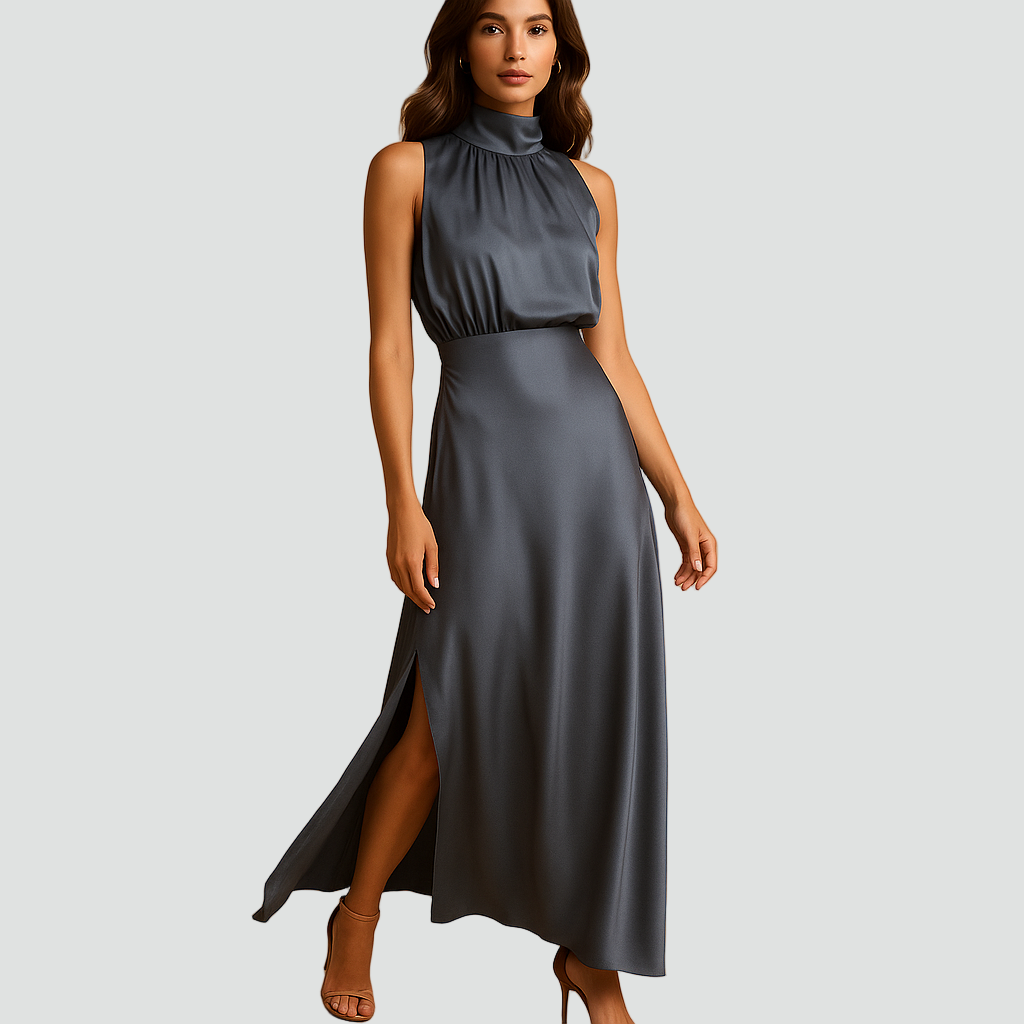 Ta elegancka długa sukienka to kwintesencja kobiecego szyku. Delikatnie połyskujący materiał subtelnie układa się na sylwetce, a wysoki golf nadaje kreacji nowoczesnego charakteru. Rozcięcie na nodze dodaje lekkości i zmysłowości, idealnie równoważąc klasyczną formę.