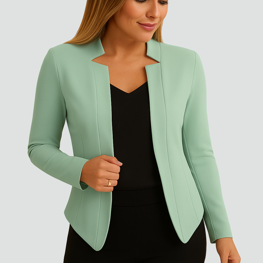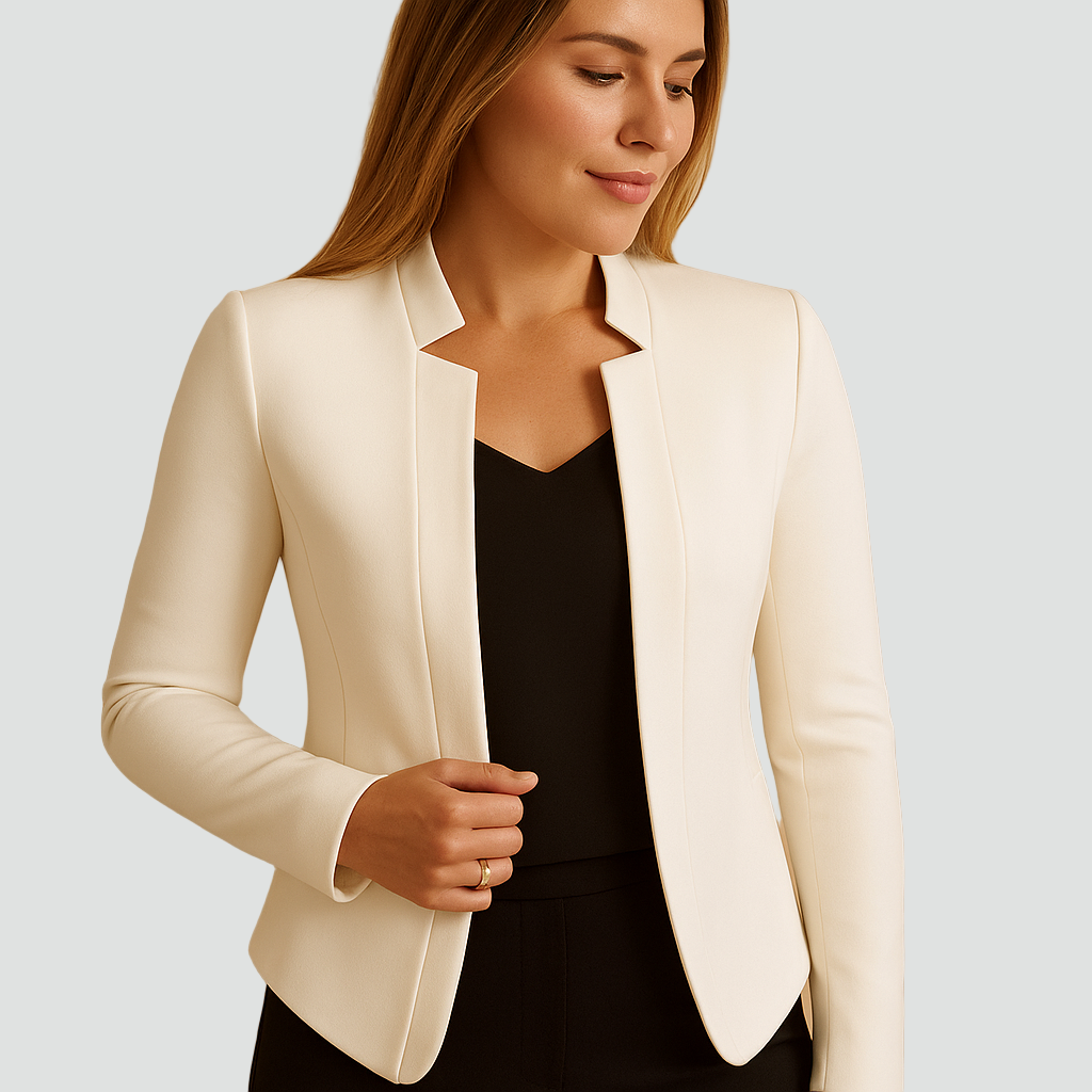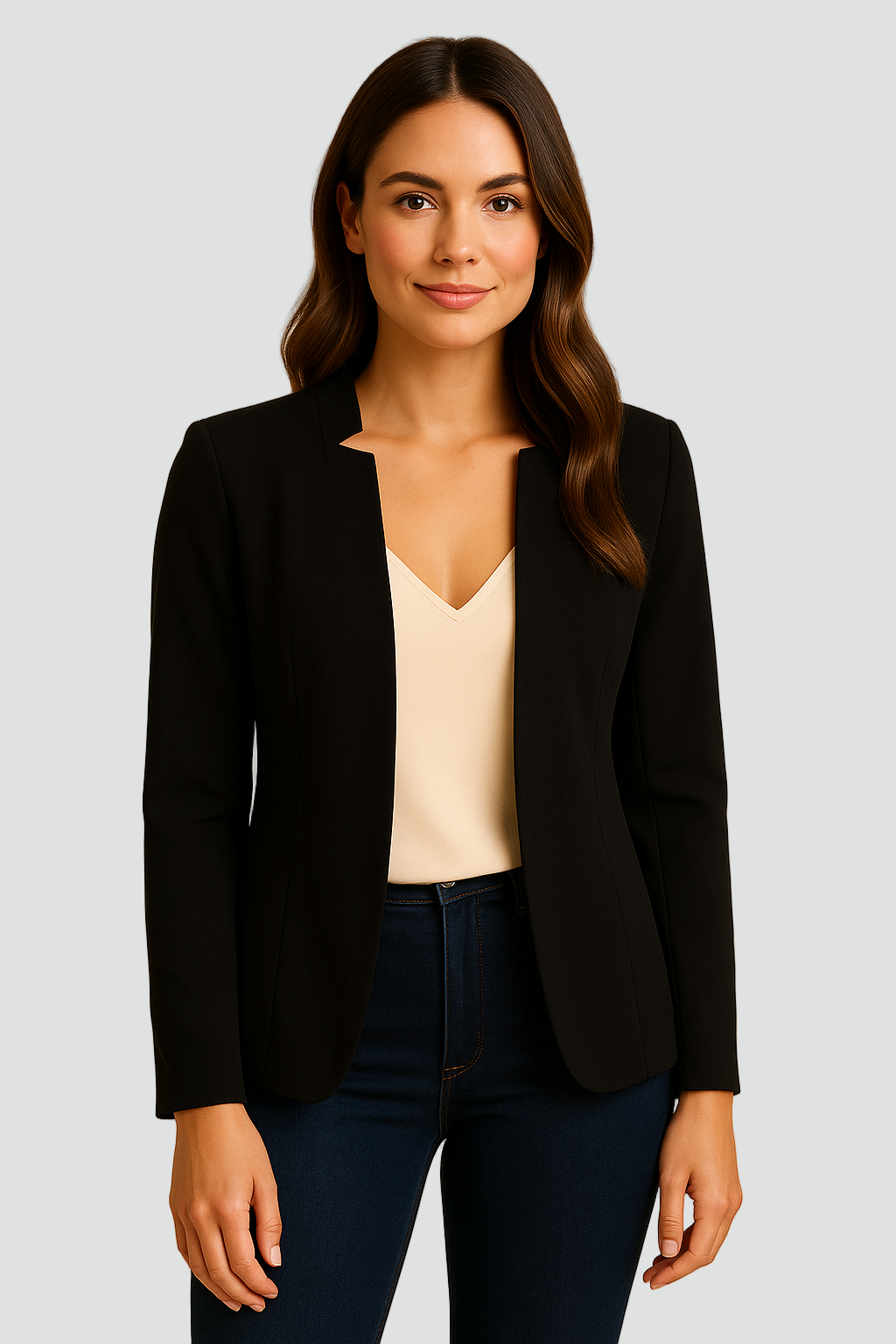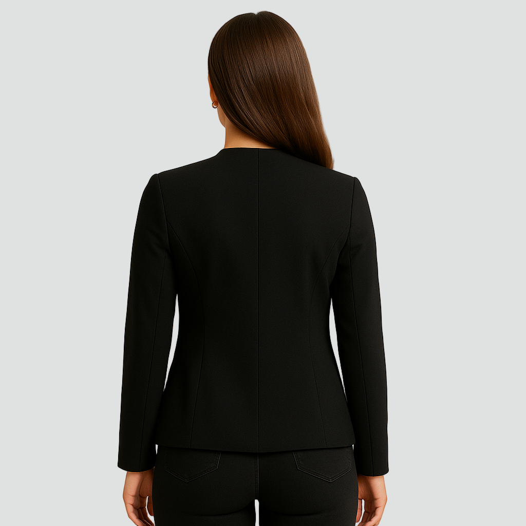 Ta lekka marynarka to idealny wybór dla kobiet ceniących prostotę i elegancję. Taliowany krój subtelnie podkreśla sylwetkę, a minimalistyczny design bez kołnierza nadaje jej nowoczesnego charakteru. Dzięki lekkiej konstrukcji i gładkiej tkaninie świetnie sprawdzi się zarówno w pracy, jak i w codziennych stylizacjach.