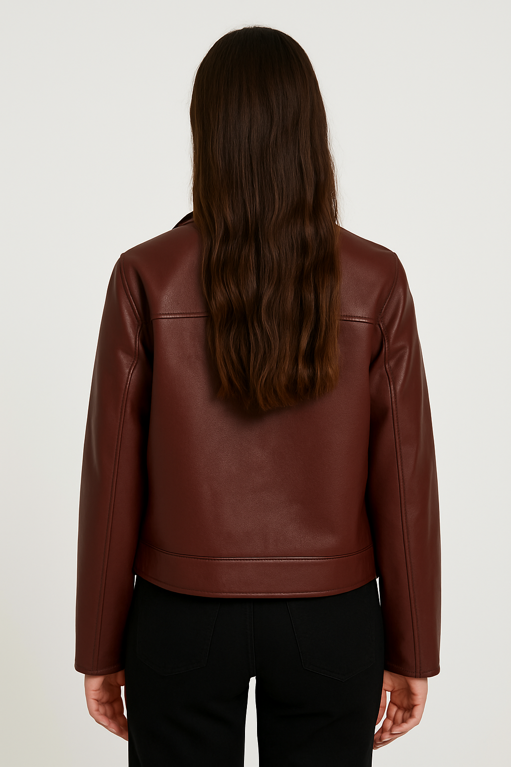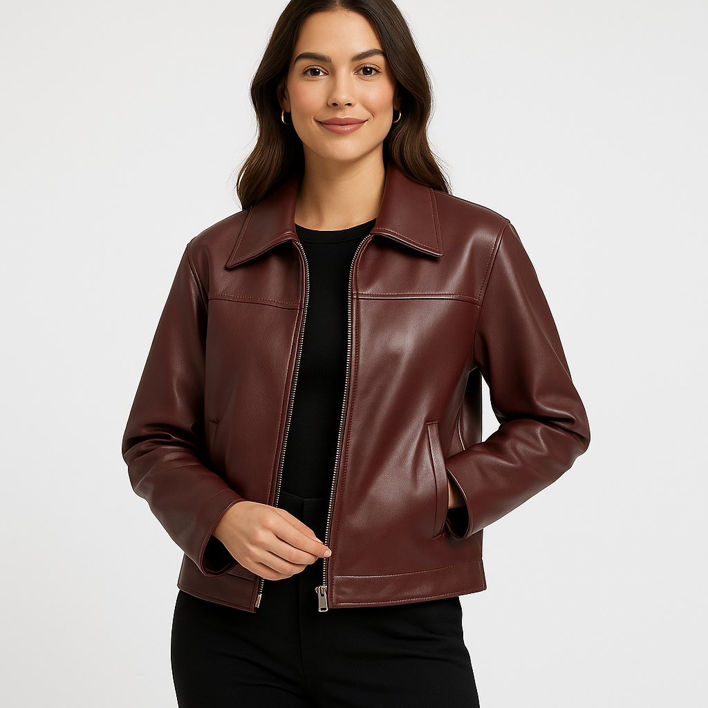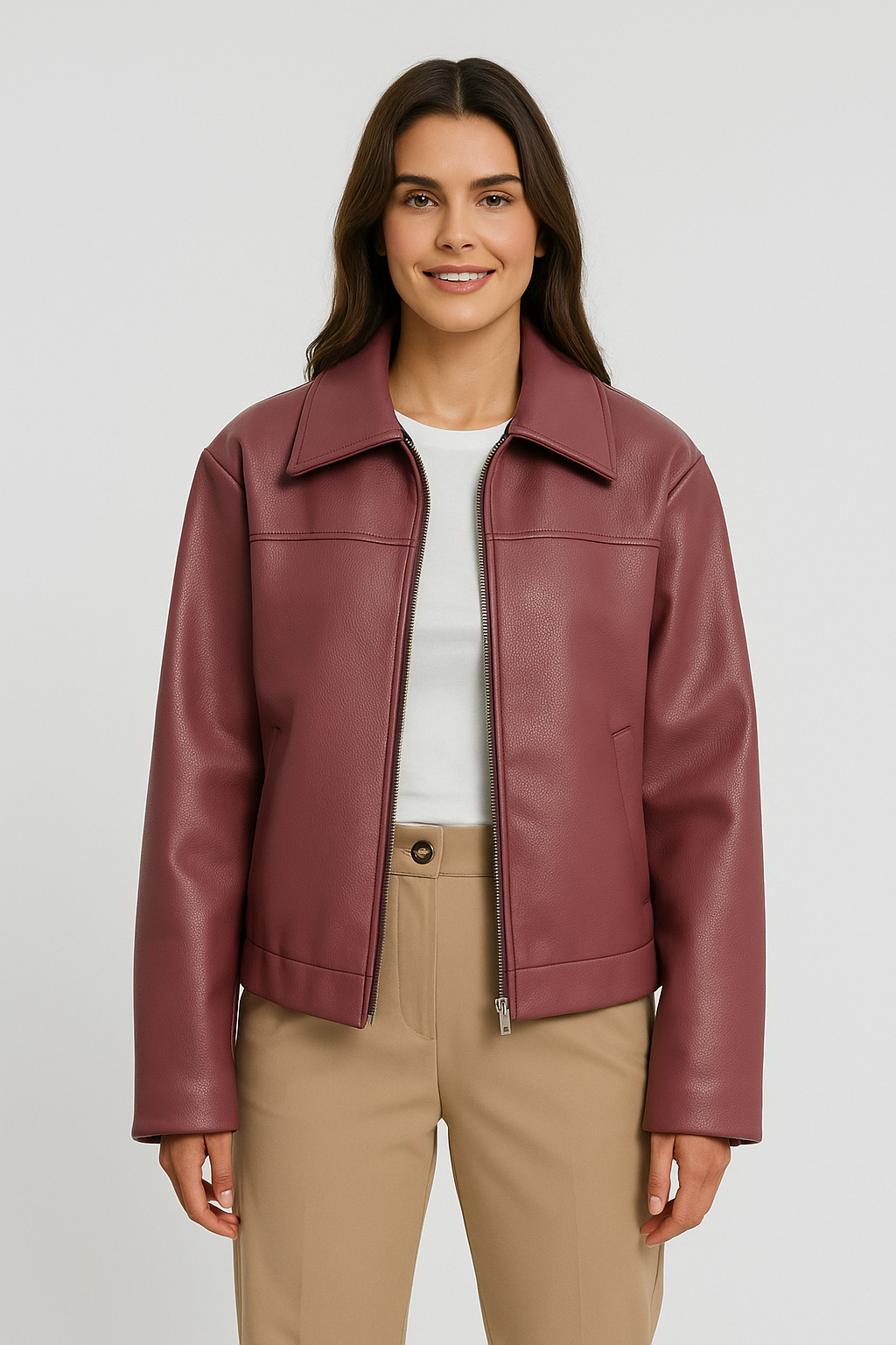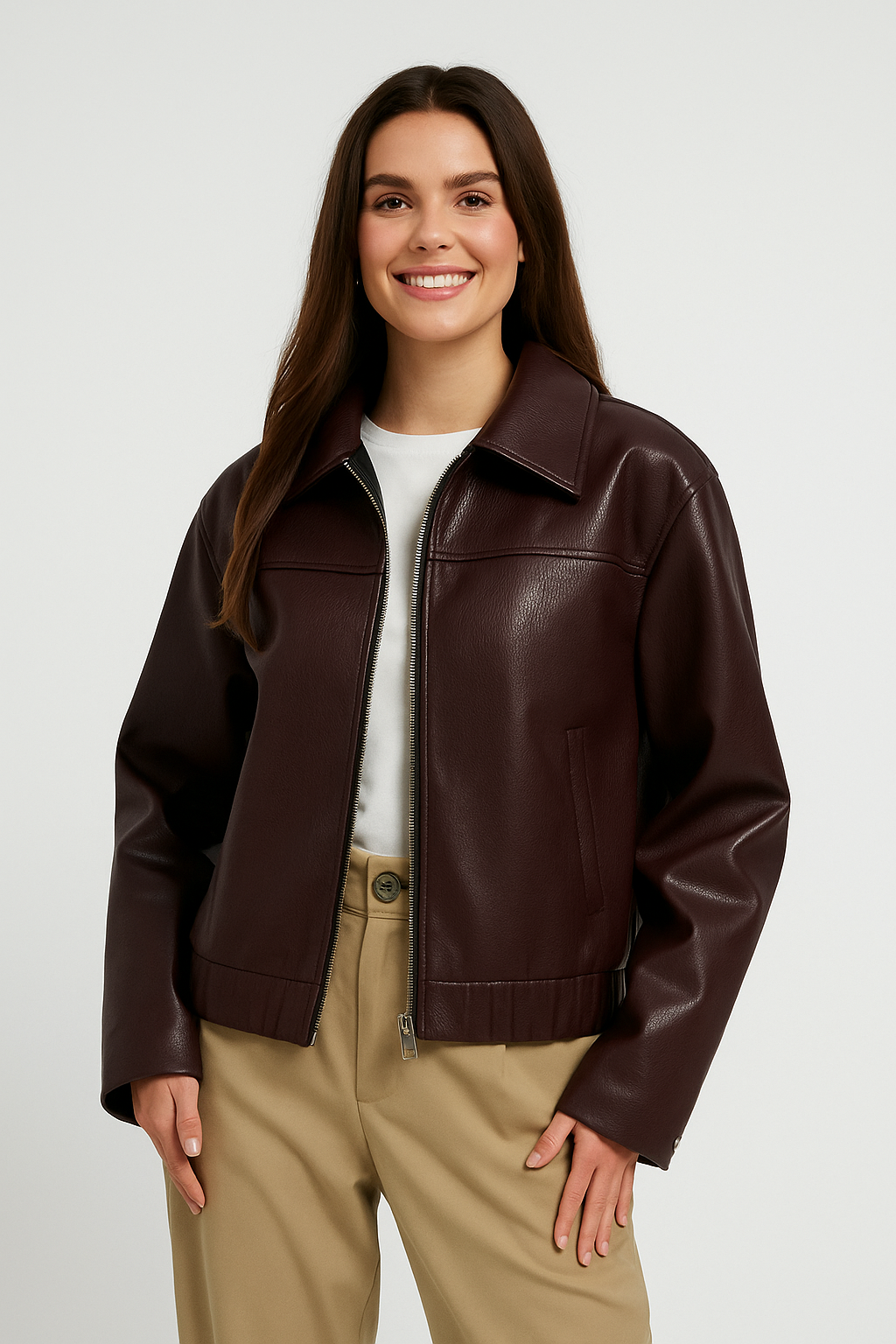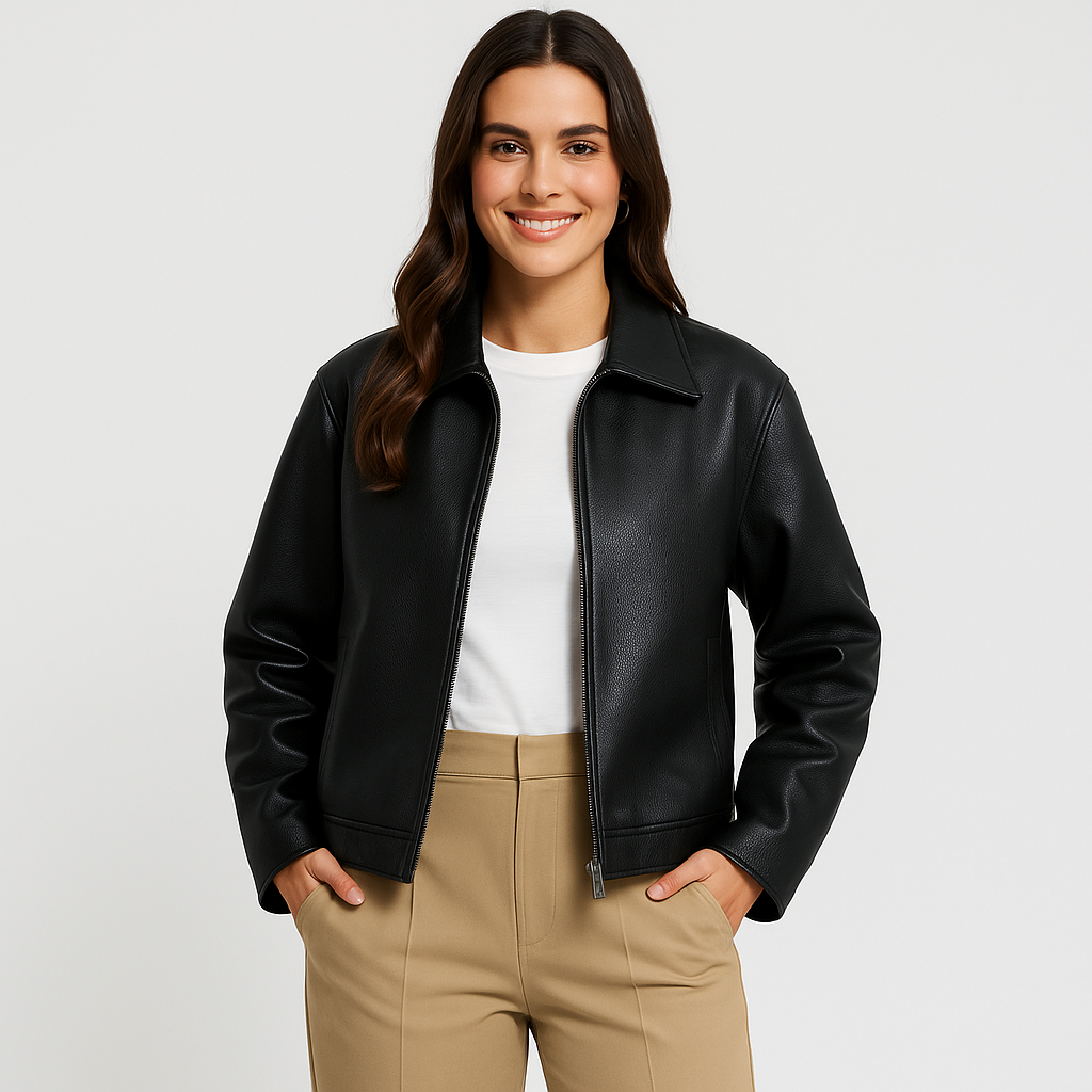 Ta krótka kurtka z eko skóry to połączenie nowoczesnego stylu i ponadczasowej klasyki. Gładkie wykończenie i prosty fason nadają jej elegancki wygląd, a klasyczny kołnierz i zamek błyskawiczny z przodu dodają całości charakteru. Idealna do stylizacji na co dzień, do pracy czy wieczorne wyjścia.