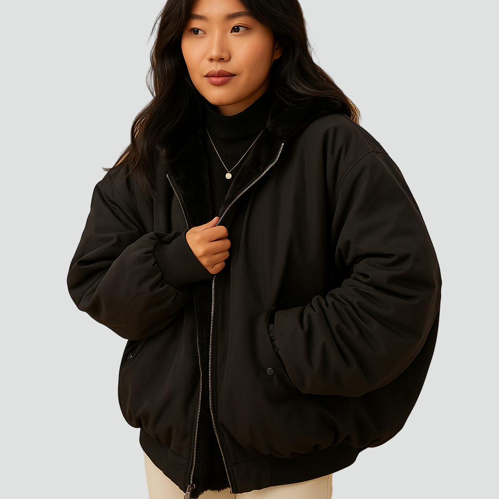Stylowa kurtka bomber z miękkim kołnierzem ze sztucznego futerka to połączenie wygody i modnego designu. Lekko oversize’owy krój zapewnia swobodę ruchów, a przyjemne w dotyku ocieplenie gwarantuje komfort w chłodniejsze dni. Elastyczne ściągacze przy rękawach i dole nadają jej sportowego charakteru, zachowując jednocześnie kobiecy styl.
