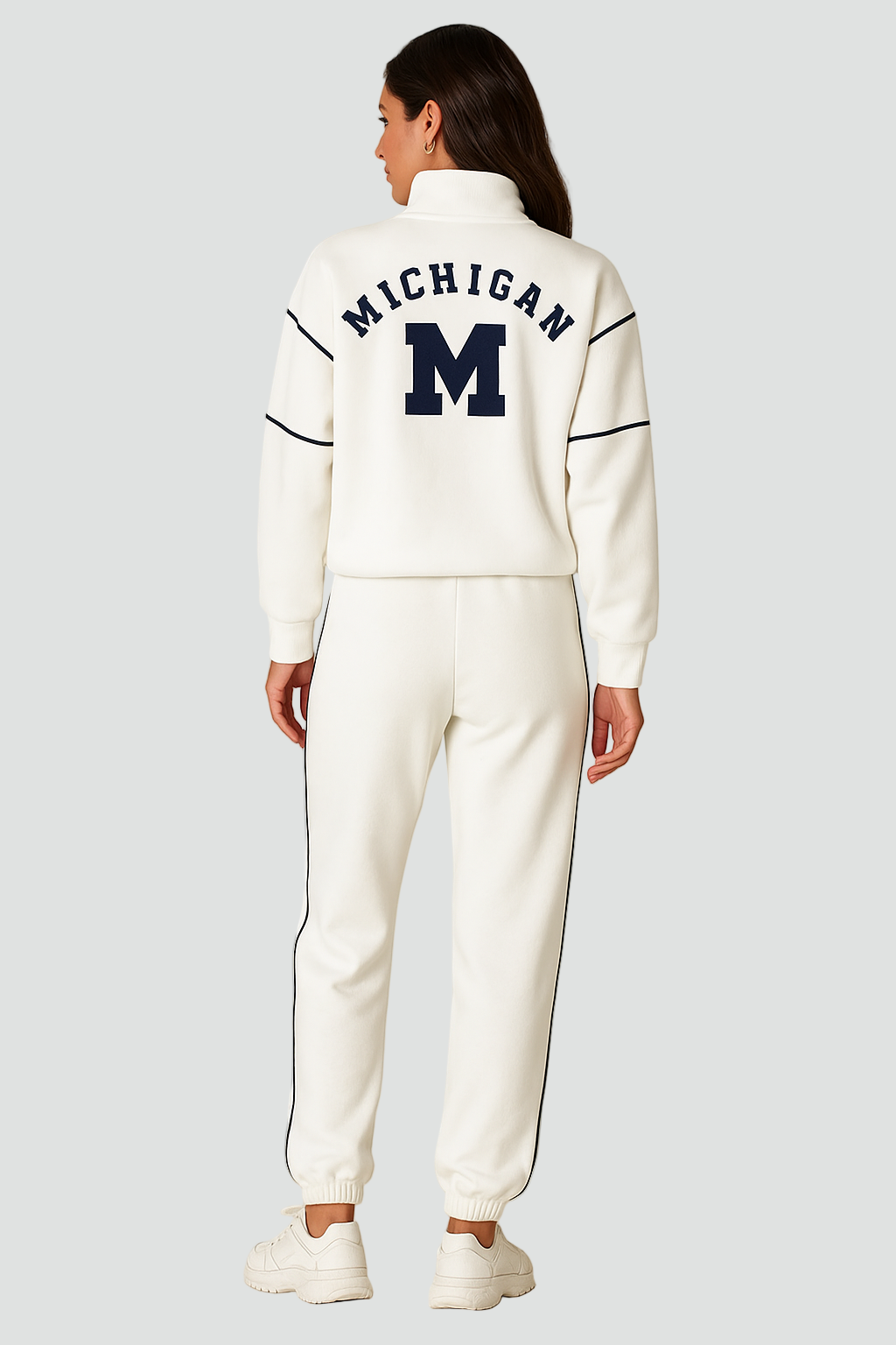 Ten sportowy zestaw to idealne połączenie wygody i stylu. Bluza z półgolfem i delikatnymi paskami nadaje całości nowoczesny, modny wygląd, a spodnie typu jogger zapewniają pełen komfort ruchu. Całość prezentuje się sportowo, ale jednocześnie kobieco — świetny wybór na codzienne aktywności i luźniejsze dni.
