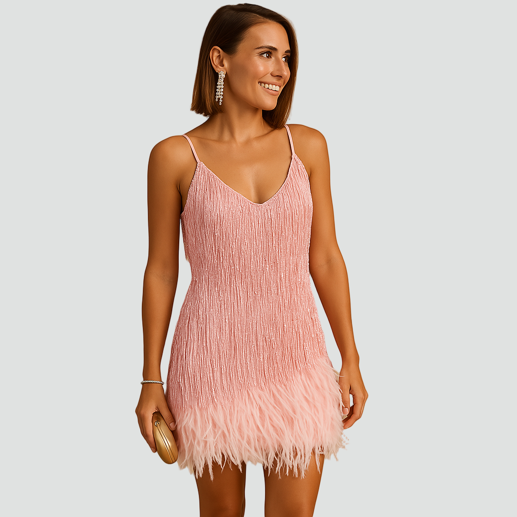 Sukienka koktajlowa mini z cekinami i piórkowym wykończeniem